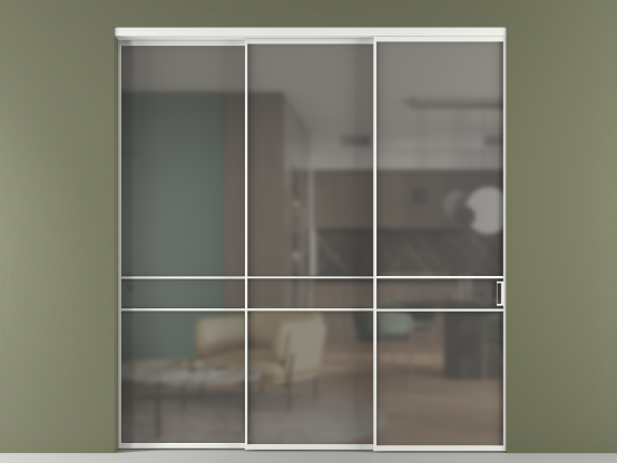Во всех алюминиевых перегородках, независимо от типа установки, используется компланарный раздвижной механизм, благодаря которому декоративная крышка и полотно находятся в одной плоскости.