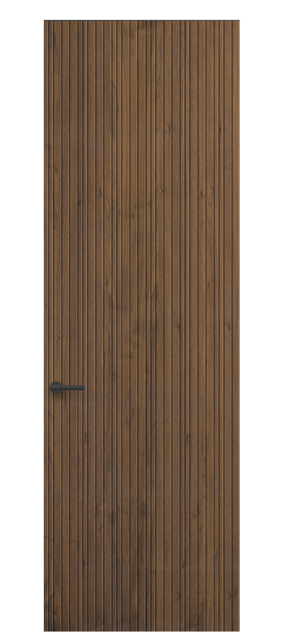 SELECT — коллекция минималистичных дверей с фрезеровкой по натуральному шпону. Рельеф на поверхности полотна создаёт игру света и тени, добавляя пространству динамичности и визуального объёма. Двери SELECT в сочетании со стеновыми панелями и мебельными фасадами, повторяющими лаконичный дизайн, создают единое стилевое решение.