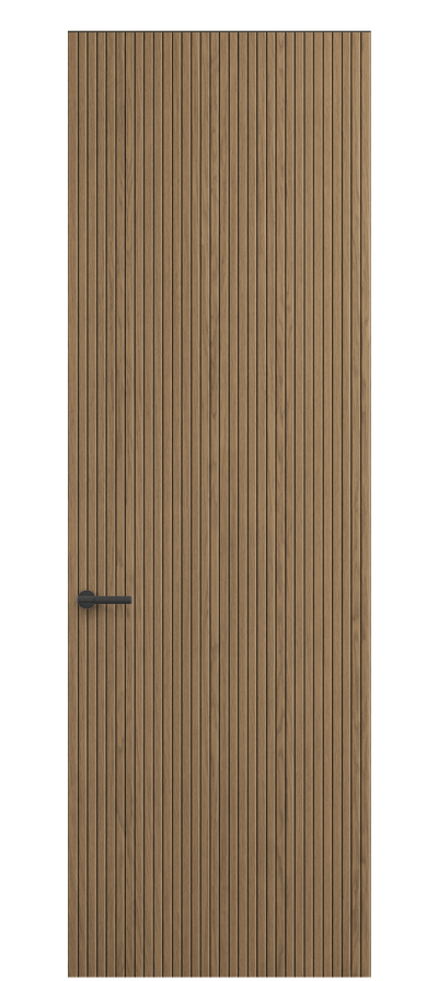 SELECT — коллекция минималистичных дверей с фрезеровкой по натуральному шпону. Рельеф на поверхности полотна создаёт игру света и тени, добавляя пространству динамичности и визуального объёма. Двери SELECT в сочетании со стеновыми панелями и мебельными фасадами, повторяющими лаконичный дизайн, создают единое стилевое решение.
